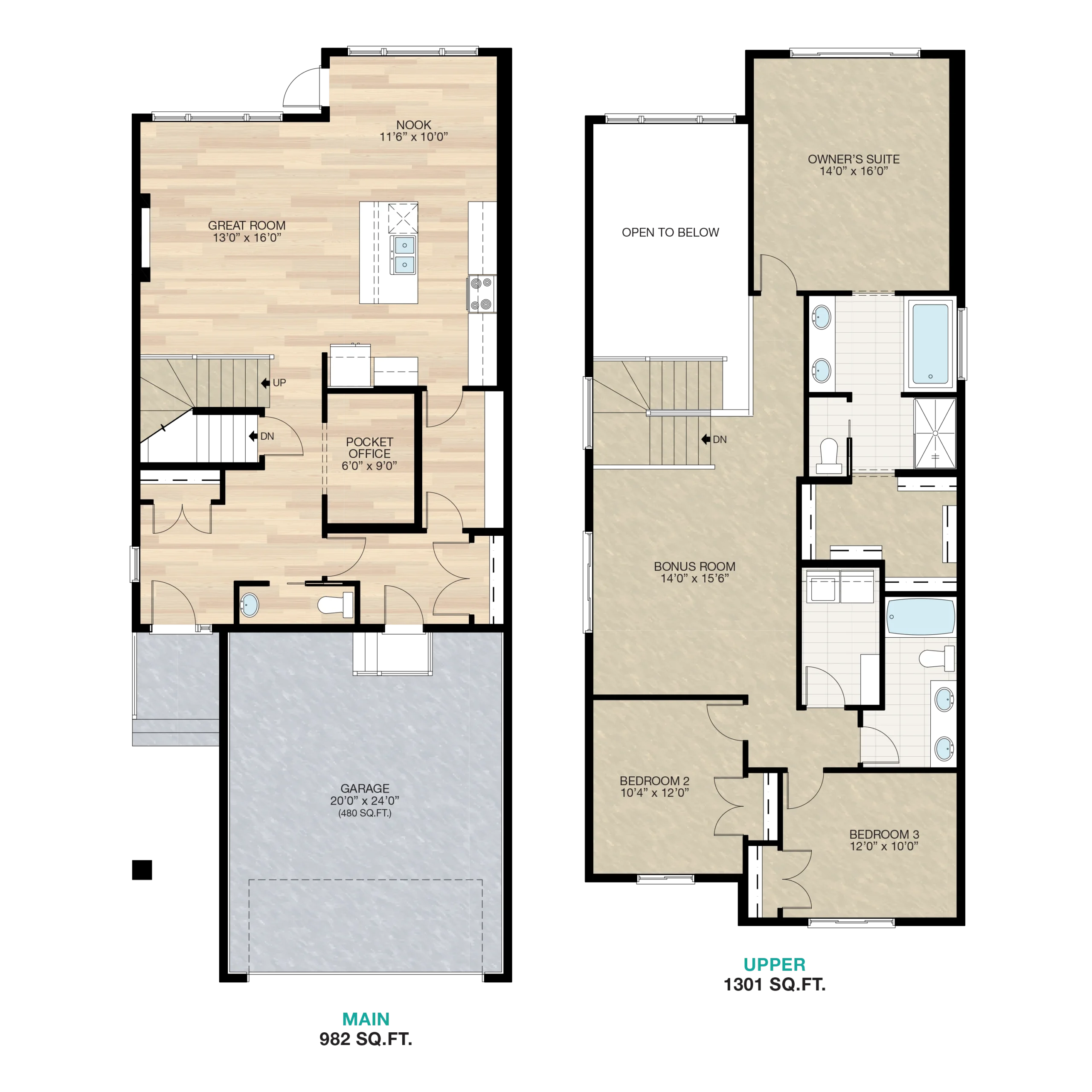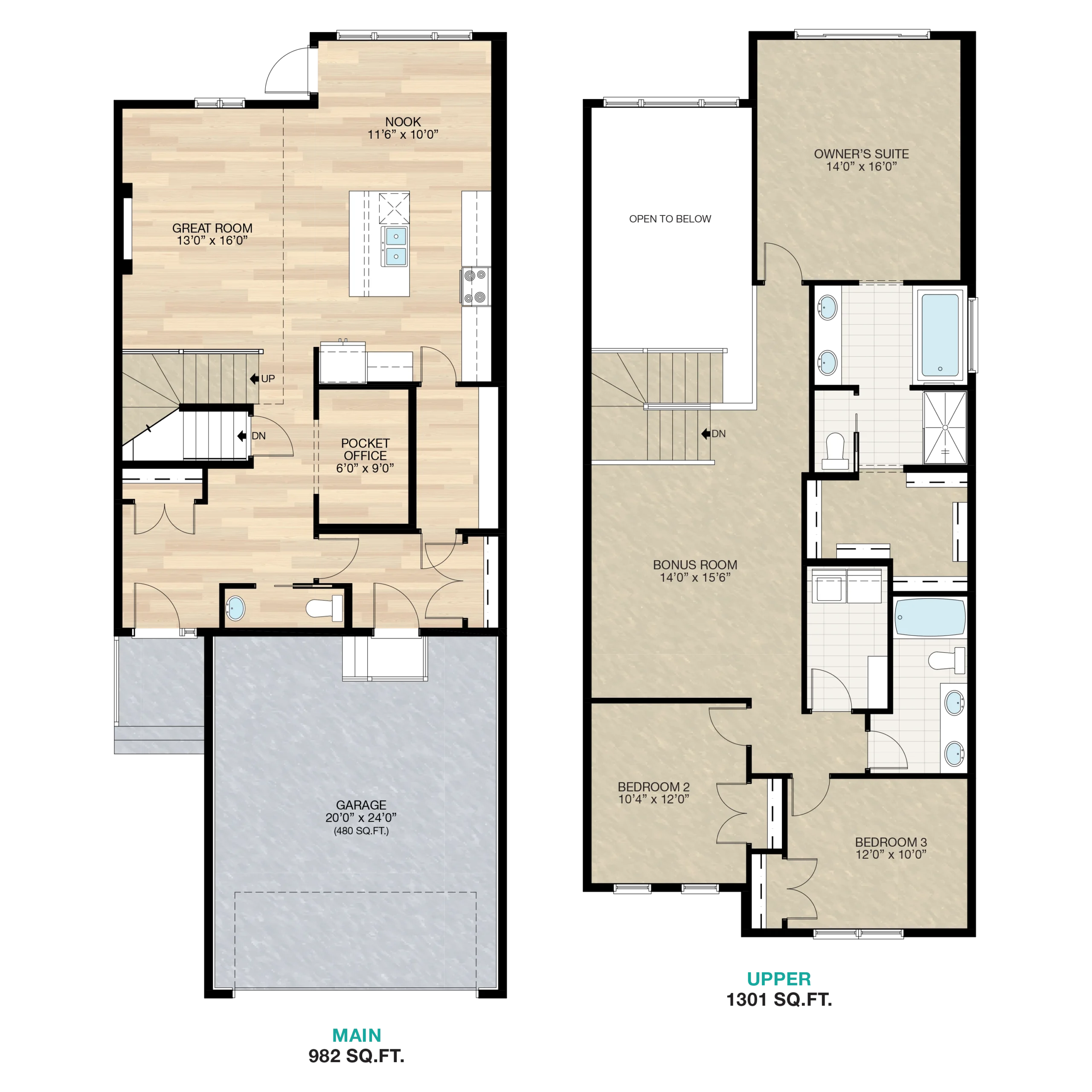 The Cambridge 26 offers a bright, airy main floor anchored by an 18-foot great room with a cozy fireplace and an open-to-below design that makes the space feel truly expansive. A practical pocket office sits close by—perfect for catching up on emails or keeping daily routines organized—while the walk-through pantry adds effortless flow between the kitchen and everyday storage. Upstairs, a central bonus room creates a natural separation between the owner’s retreat and the additional bedrooms, giving everyone their own space to unwind.