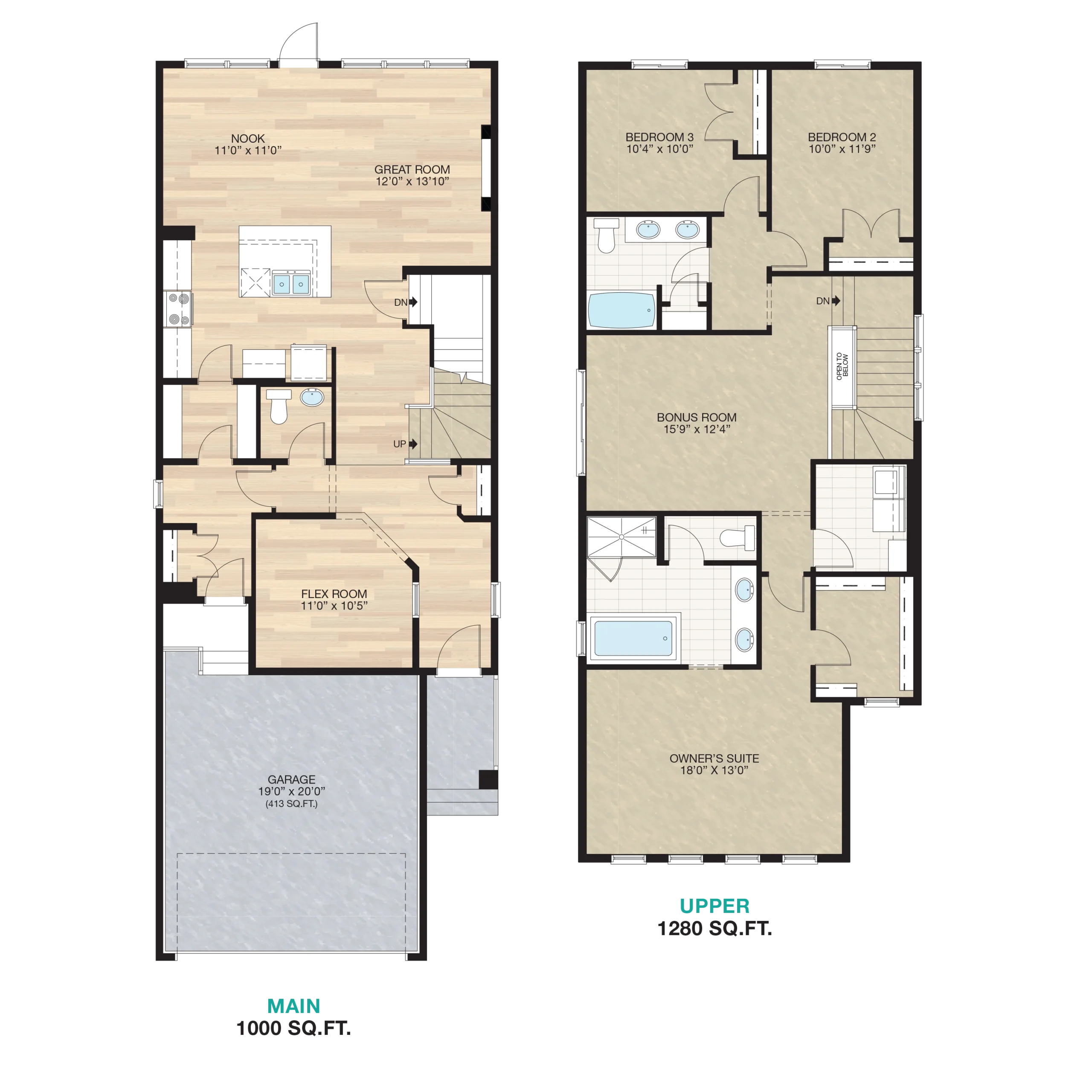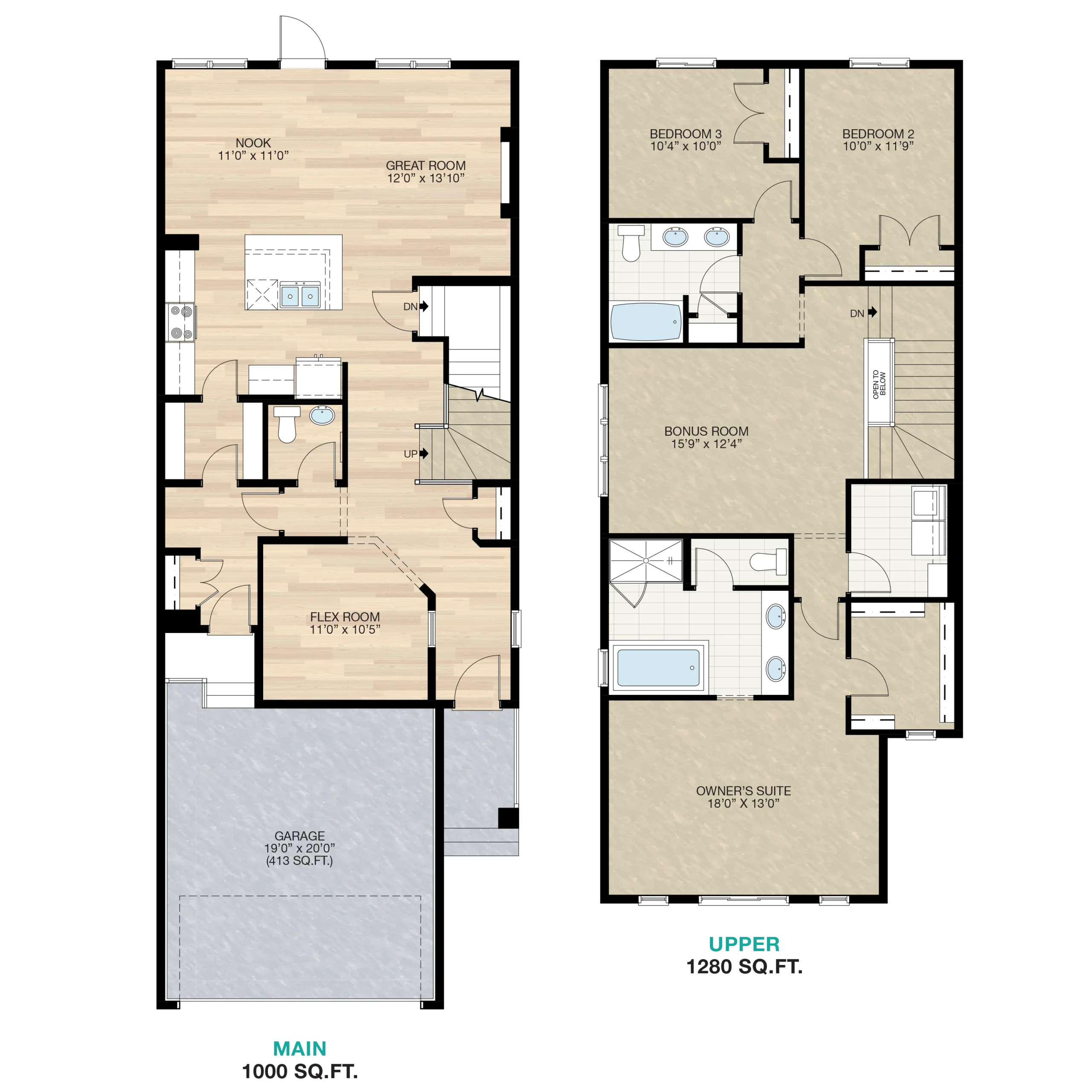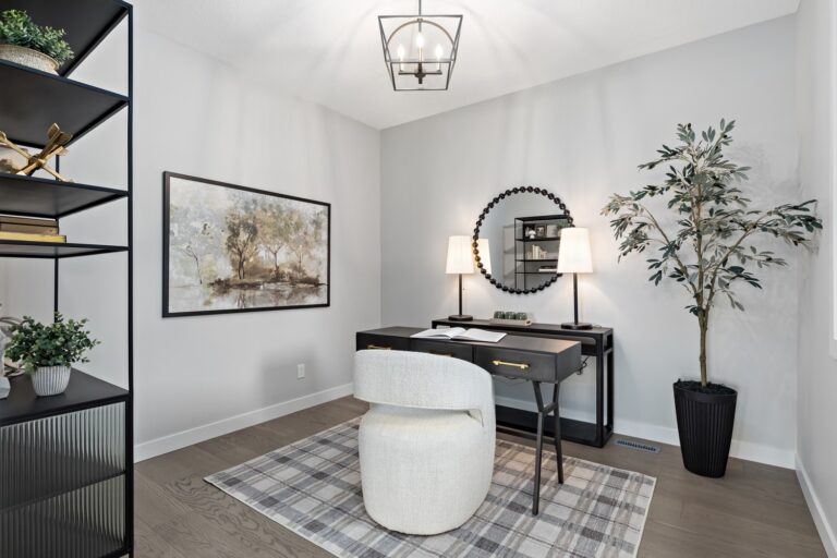 The Concord features a large flex room just off the entry, with easy access to both the stairway and kitchen, making it well suited for a home office, study, or quiet retreat. A centrally located bathroom adds convenience on the main floor, while upstairs a central bonus room creates separation between two additional bedrooms and the owner’s suite with a five-piece ensuite.