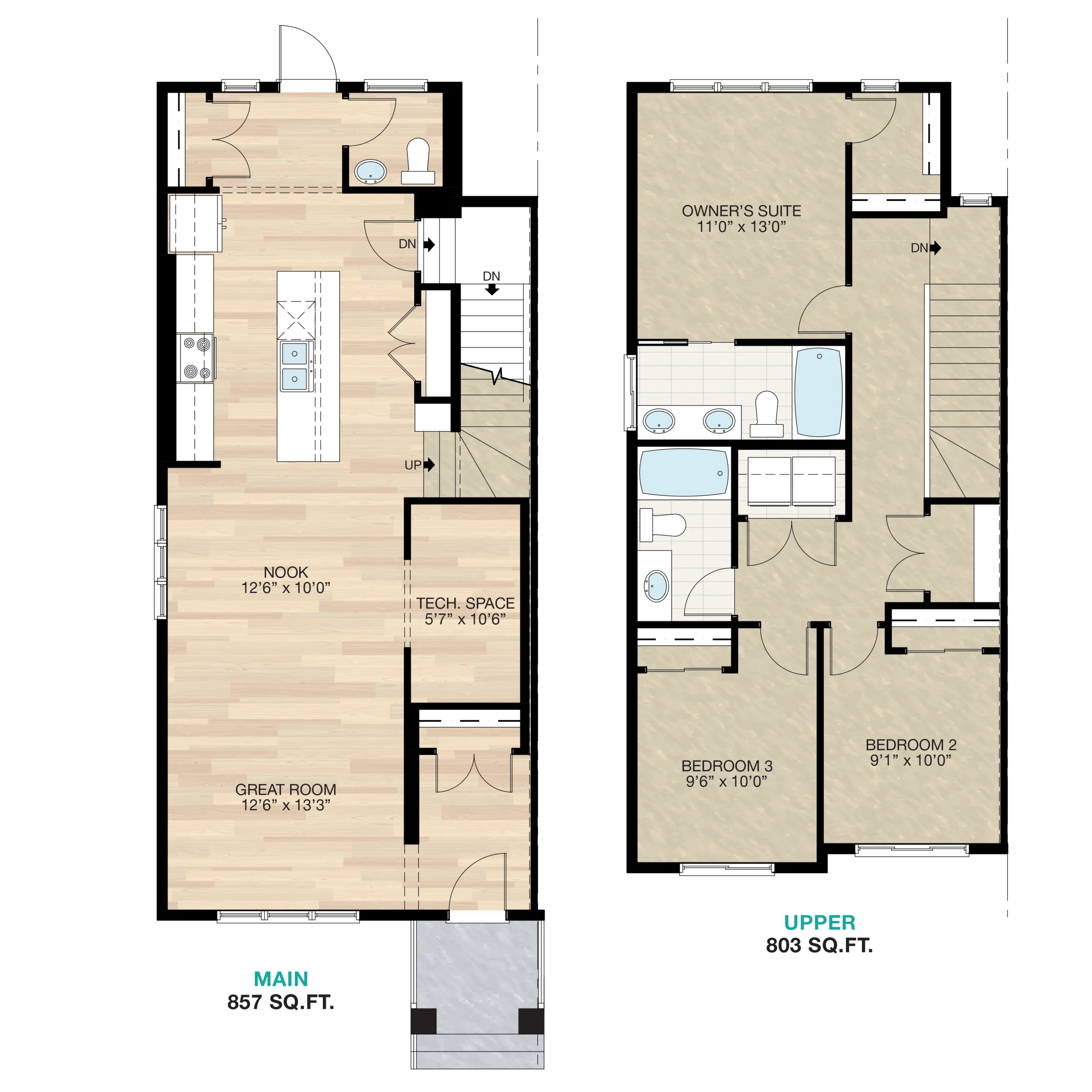The Lancaster Duplex offers a welcoming main floor with a dedicated tech area that adds practical versatility, while upstairs a well-planned layout includes the owner’s suite with a walk-in closet and private ensuite, alongside two additional bedrooms and a full bathroom for balanced, comfortable living.