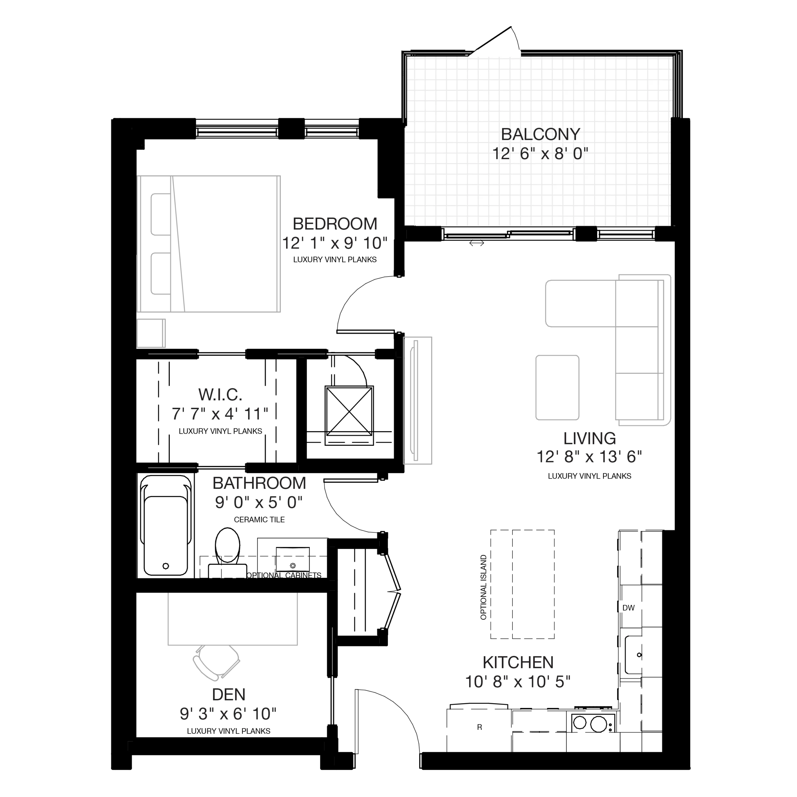 At 651 Sq.Ft., the Lorette 2 offers a refined balance of comfort and flexibility with 1 bedroom + den and 1 bath.