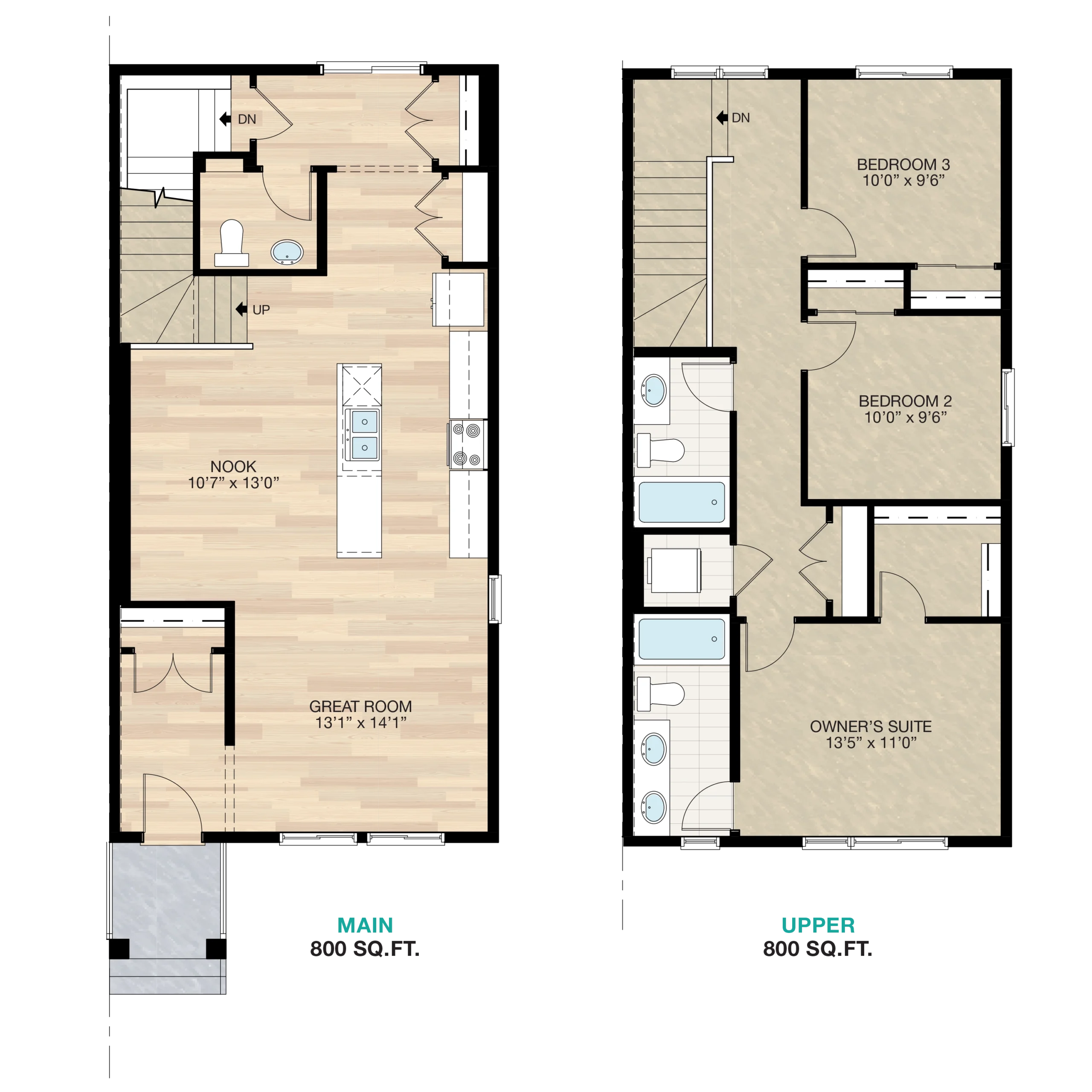 The Lougheed Duplex opens the great room, flowing naturally past a central nook and into the kitchen with a long island—creating a comfortable setup for everyday living and easy gathering. Upstairs, the owner’s suite includes a 4-piece ensuite and walk-in closet, while two additional bedrooms are thoughtfully arranged alongside a full bathroom.