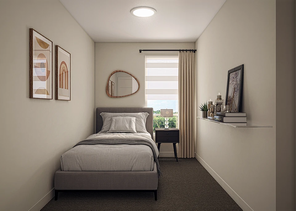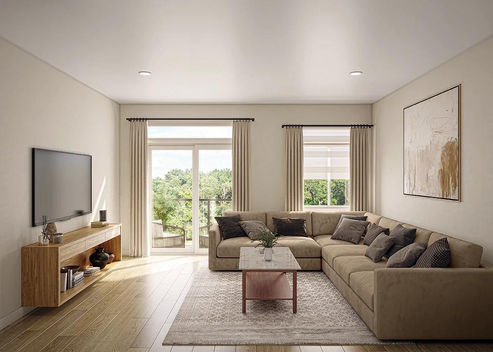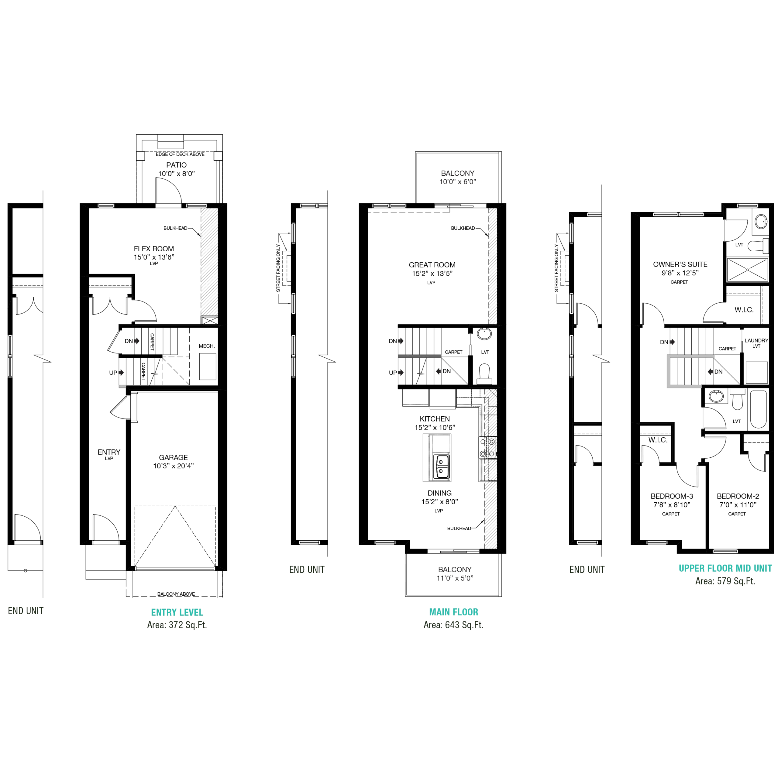 The Summit Mid-Unit offers a walkout design that adds flexibility and connection to the outdoors. The entry level features a versatile flex room with direct patio access, perfect for entertaining, working from home, or creating a private retreat.