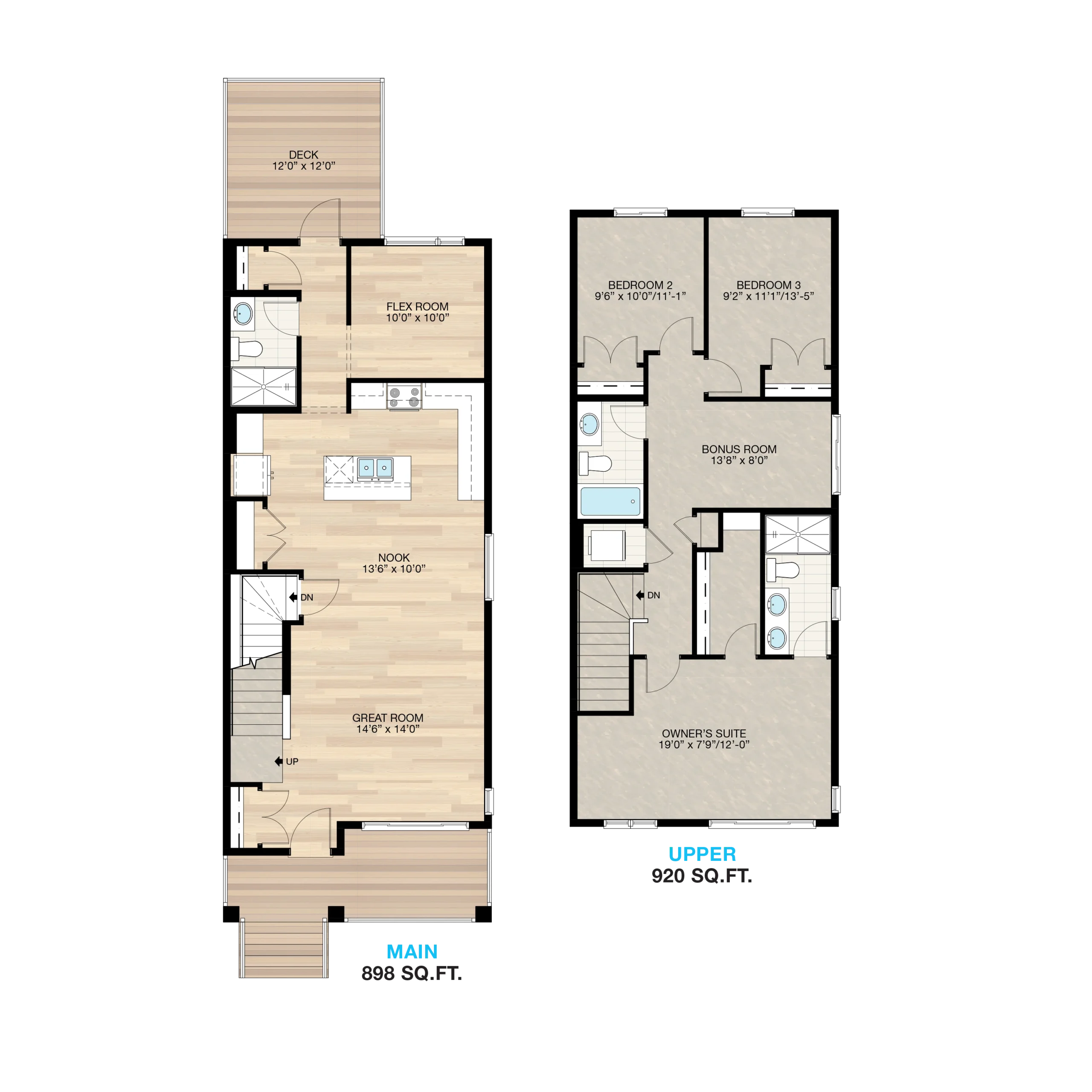 The Sandalwood offers a layout with clearly defined spaces for connection and quiet, from the front great room to the rear kitchen and a private flex room tucked at the back — perfect for work or winding down. Upstairs, a striking open-to-below feature adds light and drama, leading to two front bedrooms and a rear owner’s suite with a 4-piece ensuite.