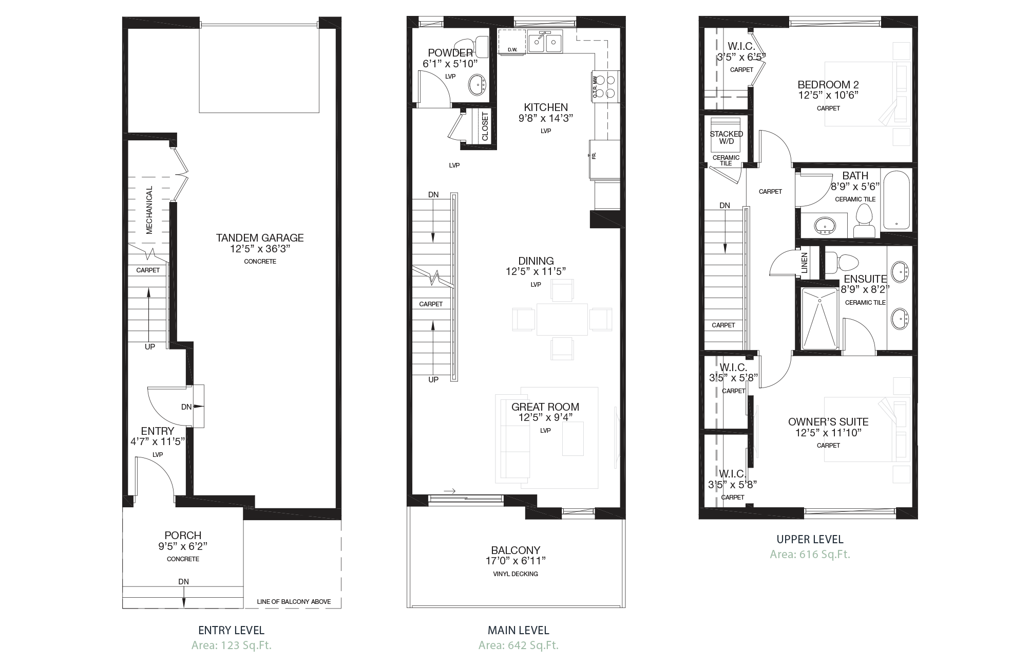 The Granville offers a conveniently located powder room right off the stairs to the main floor, followed by an open-concept main floor with a kitchen, dining room and great room perfect for hosting. Upstairs, the owner’s suite features a 4-piece ensuite and a dual entry walk-in closet.