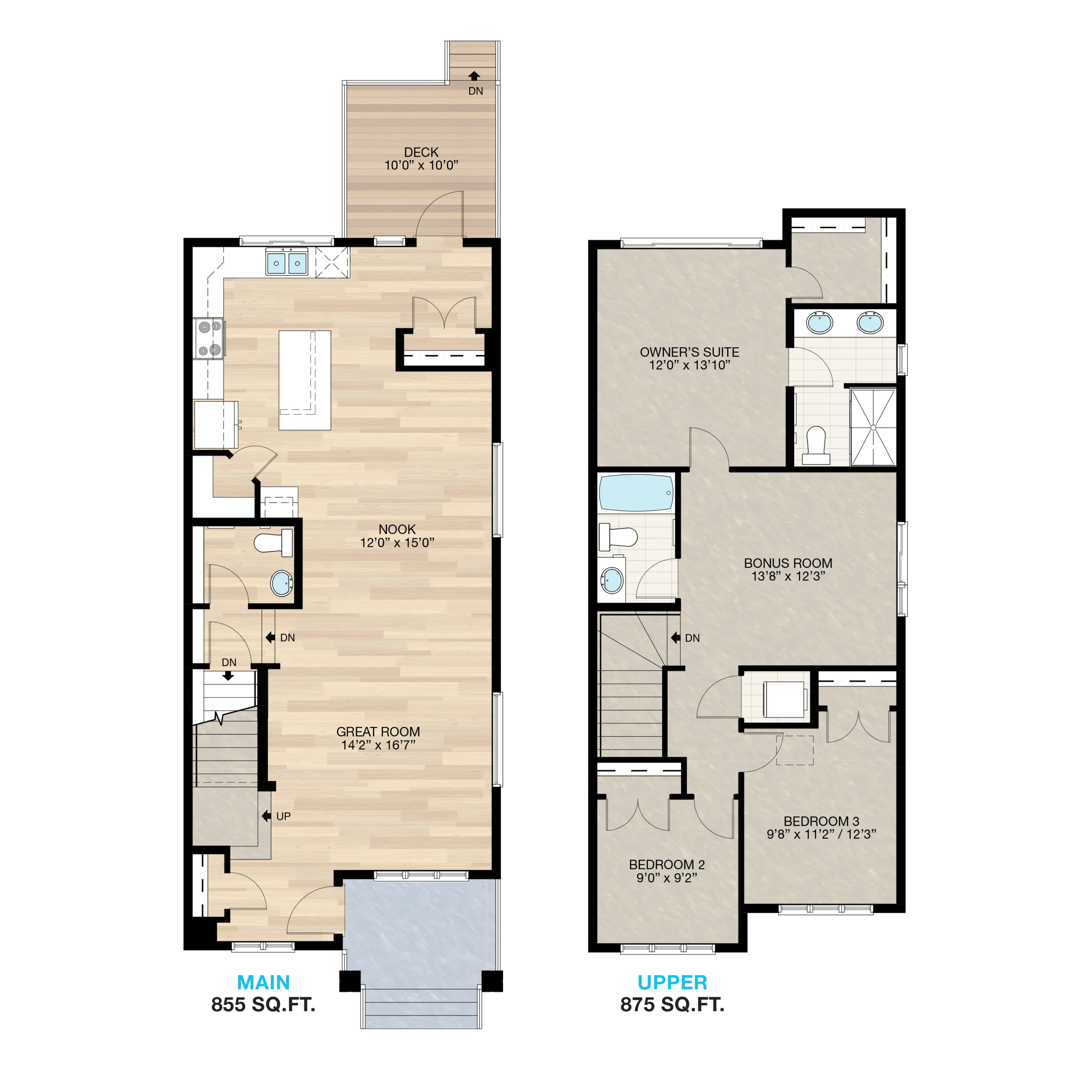 The Rowan II offers an inviting layout that brings everyone together, with the great room right at the front of the home and a rear L-shaped kitchen and nook designed for connection and ease. Upstairs, a central loft leads to two front-facing bedrooms and a private owner’s suite at the end, complete with a spacious walk-in closet and elegant 5-piece ensuite.