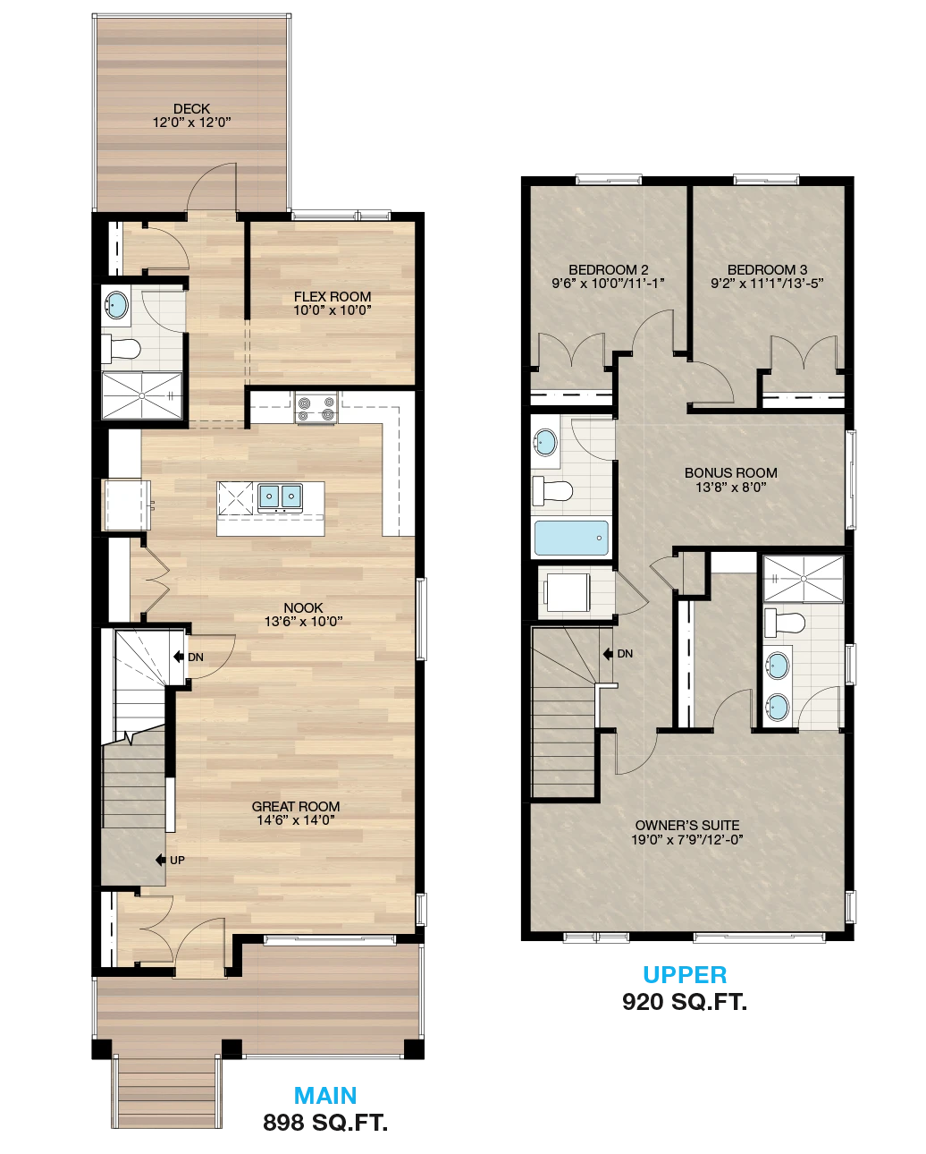 The Sandalwood offers a layout with clearly defined spaces for connection and quiet, from the front great room to the rear kitchen and a private flex room tucked at the back — perfect for work or winding down. Upstairs, a striking open-to-below feature adds light and drama, leading to two front bedrooms and a rear owner’s suite with a 4-piece ensuite.